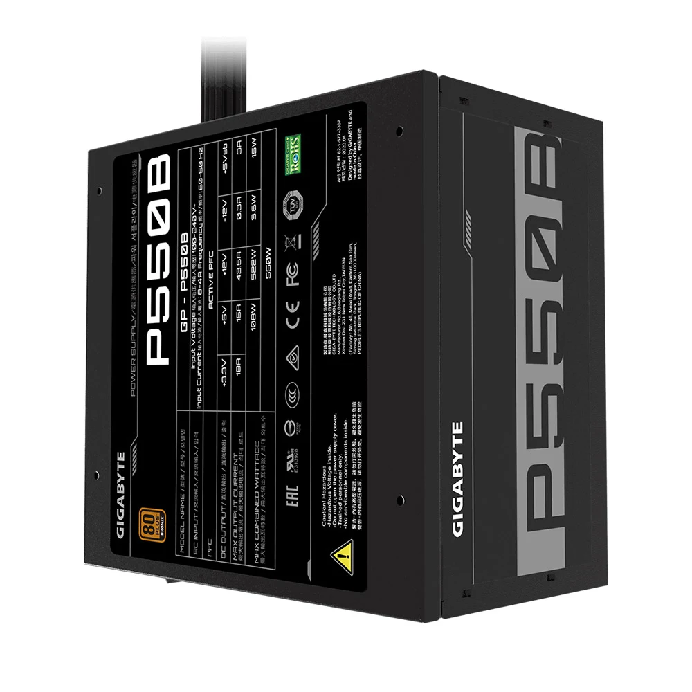 Nguồn Power Gigabyte 550W GP-P550B được chứng nhận chuẩn 80 Plus Bonze, 80 Plus là tiêu chuẩn được đặt ra nhằm đánh giá một bộ nguồn có đủ an toàn và khả năng hoạt động ổn định, giúp cho người sử dụng dễ dàng tìm kiếm bộ nguồn phù hợp, 80 Plus Bronze đảm bảo mang lại hiệu suất 85% khi tải 50%. Hiệu suất điện năng tốt hơn dẫn đến ít lãng phí điện năng hơn, ít nóng hơn và ít tiếng ồn của quạt hơn.
